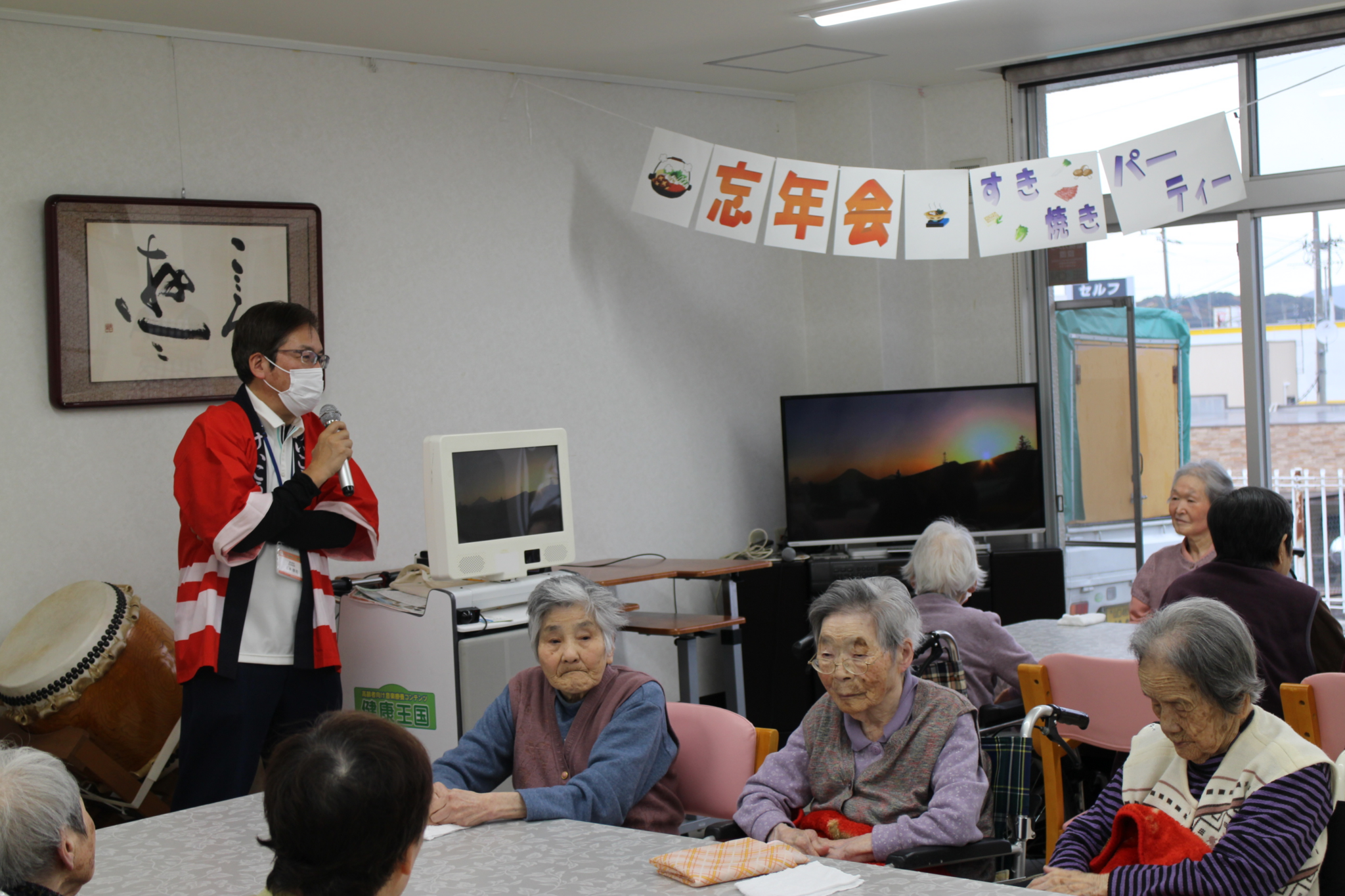 12月11日、お昼の食事ですき焼きを食べながら、苑生さんの忘年会を行いました。